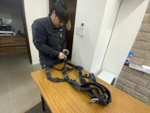 講習では作業の危険性やフルハーネスの構造と点検のポイント、正しい装着方法や使用時の注意事項に加え、万が一の墜落時に備えた対応についても確認しました。