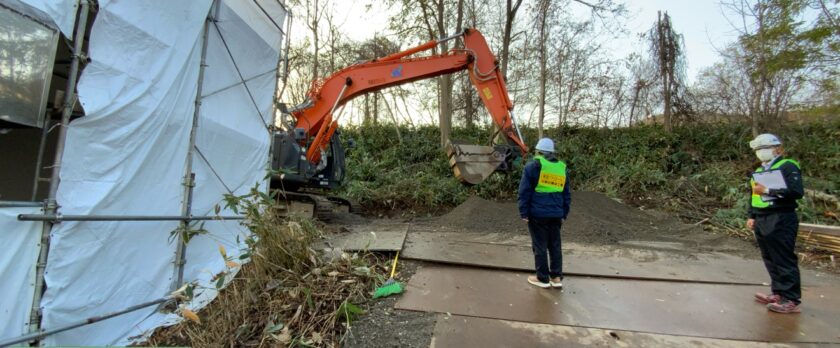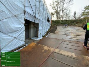 室蘭市の改修現場では、重機が通る斜面に鉄板が敷かれ、安全に走行できるよう配慮されていました。